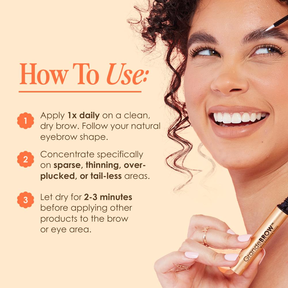 - Carefully apply GrandeBROW once daily on a clean, dry brow to the natural shape of your brow, concentrating on sparse, thinning or over-plucked areas.