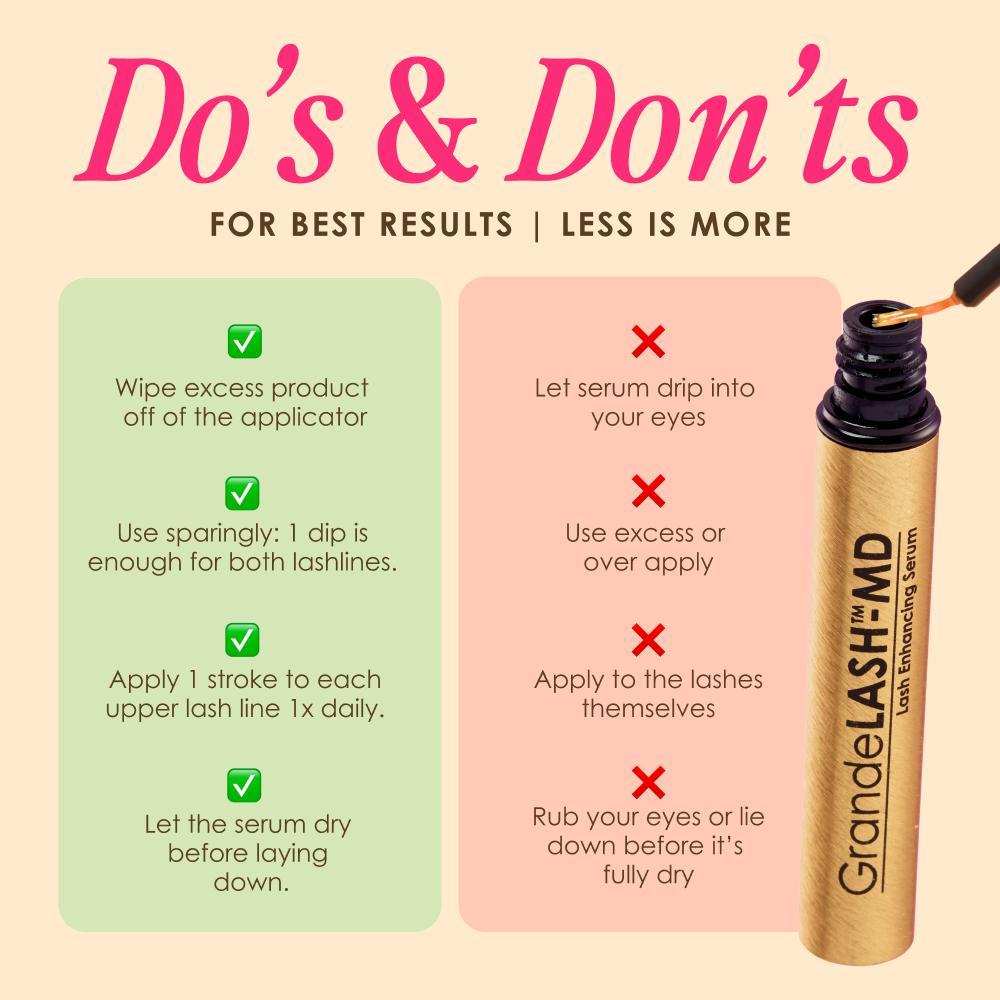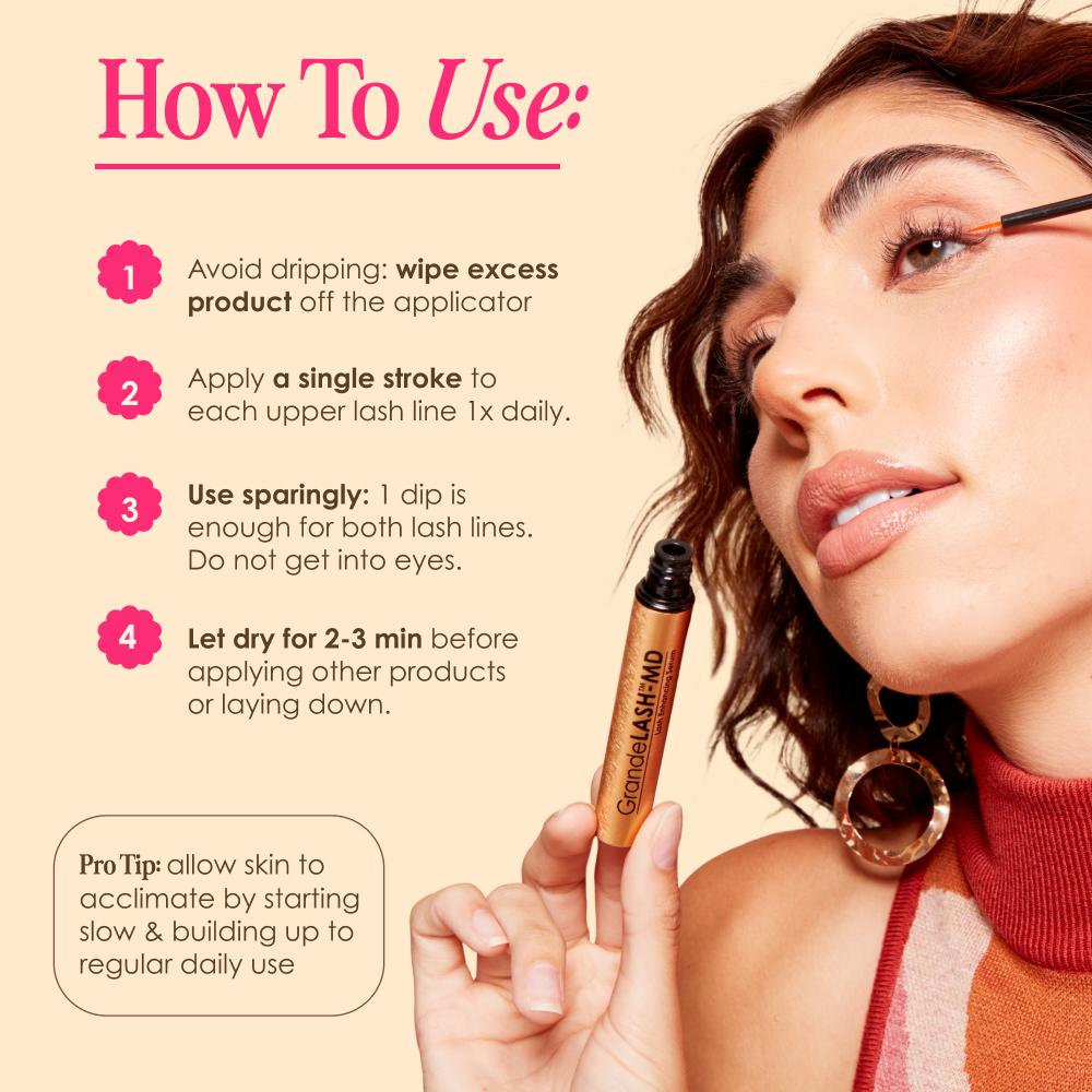 - GrandeLASH-MD Directions: As with all cosmetic products used in the area of the eye (or close proximity to the eye), it is important to carefully read all directions and warnings.